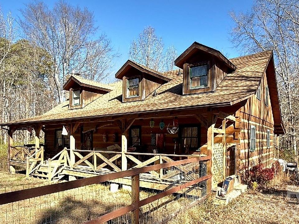 Welcome Home to this STUNNING log cabin home nestled on 5.06 acres of your very own private lot. Set off the main road, this property offers private, wooded views from either your front porch or your back porch (you pick!). This unique home lovingly built by the current owner has stunning wooden beams and architecture throughout. The main floor features an open concept with lots of natural light and 2 bedrooms sharing one full bath. The stone fireplace in the living room is a show stopper! Upstairs you will find a large loft space.