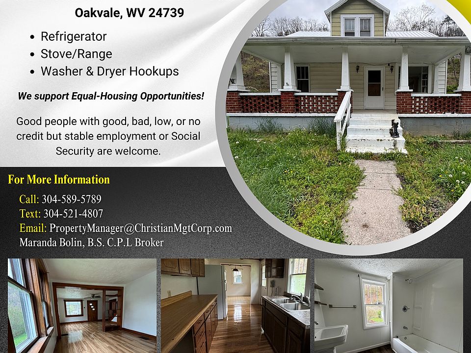 10217 Cumberland Rd. ~ 3 Beds 1 Bath ~ Oakvale, WV 24739 LEASE OPTION (Path to Home Ownership): Initial payment: $3,500 with no payments due until the 1st of the following month! Monthly payment: $950/month. No utilities included. or RENTAL: Security Deposit: $950. Can be made in payments if needed. Monthly payment: $950/month. No utilities included. Sorry, this home is not HUD approved. This 3 bedroom, 1 bathroom house is located in the country in the small town of Oakvale, WV. This house features lots of country charm with some of the original wood throughout the home. Large covered front porch. Electric heating. Washer & dryer hookup. Hardwood and laminate flooring throughout for easy cleanup. Furnished with stove & refrigerator. Nice level lot with mailbox for easy daily mail delivery. Storage building. Move in today! Christian Management Corporation Office Hours: Mon-Fri 9:00AM-5:00PM & 10:00AM-2:00PM the 1st Saturday of every month You can view THIS property 7 days a week! Most pets welcome with a $300.00 pet fee per pet and signed pet agreement. Maximum 2 pets. No aggressive breeds due to insurance restrictions. Clean, safe, quiet, crime & drug-free are our priorities for our residents! We support Equal-Housing Opportunities! Good people with good, bad, low, or no credit but stable employment or Social Security are welcome. -MUST pass background check -NO evictions in the last 7 years -NO sex offenders Is this property not what you are looking for? View our other available #homes, #mobilehomes, #apartments, and more on our Facebook or our website!