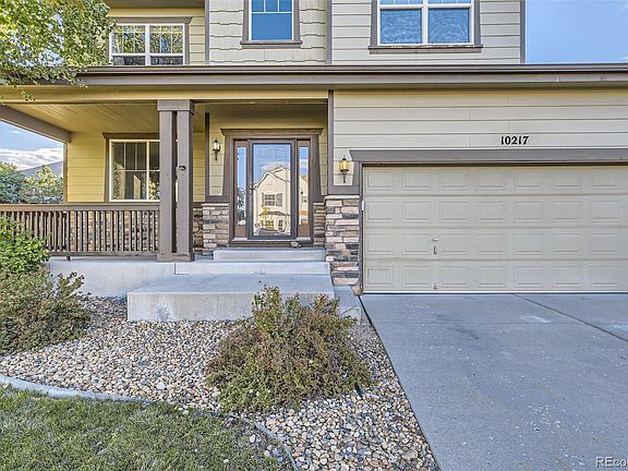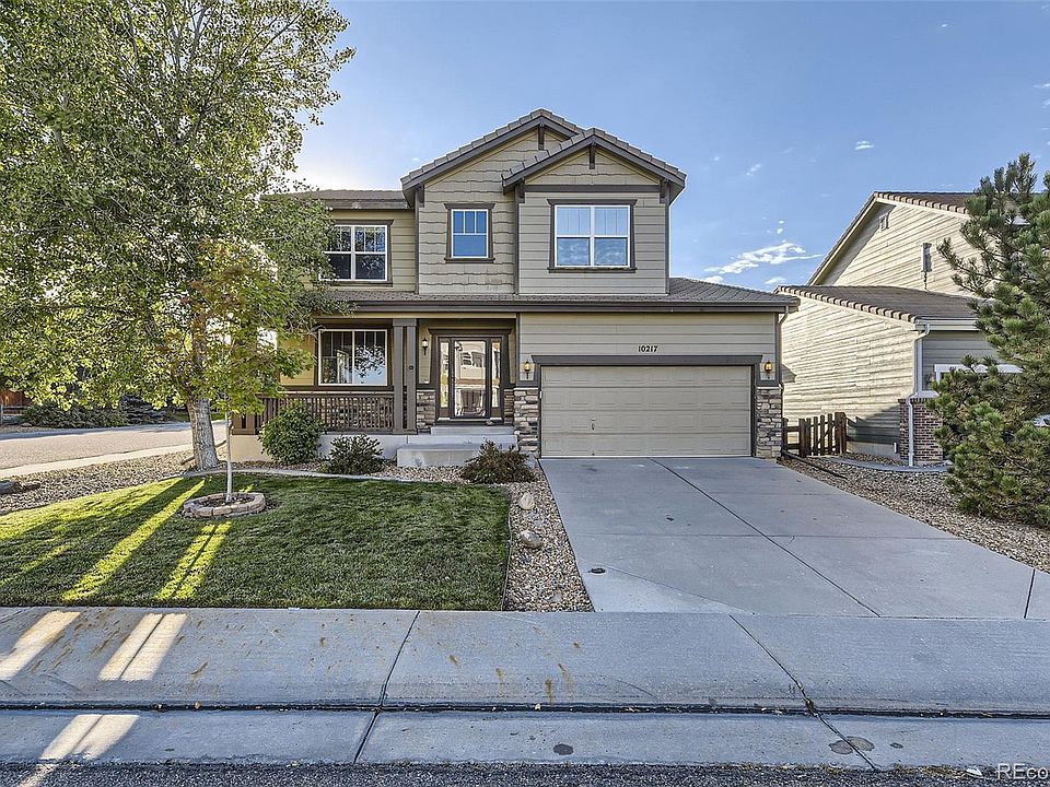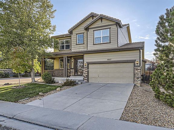 Improved Price! Make this wonderful corner lot home in beautifully maintained Meridian Village your forever home! Your new home offers 4 beds & 2.5 baths, 3 car tandem garage, upper level laundry, eat-in kitchen, custom stamped concrete patio with built in fire pit and stone bench, new paint, new appliances, year old water heater, pantry, and plenty of storage space in your unfinished basement!! Inviting front porch to enjoy your morning coffee and Colorado sunrise before heading off to work. Main floor features formal living and dining rooms just beyond your foyer with rich cherry wood flooring through entry, dining room and into your comfortable kitchen. Bright and open family room features gas fireplace and plantation shutters that flows into your well appointed kitchen featuring stunning cherry cabinets and all new stainless steel appliances, large island, spacious pantry, and attractive granite tile countertops. At the end of your day, it's time to retreat to your upper level that features your primary bedroom suite with full 5 piece en suite bathroom featuring double vanity with granite countertops, sleek finishes, large soaking tub, walk-in glass surround shower with bench seat and spacious walk in closet. The remaining 3 secondary bedrooms, hallway bathroom and conveniently located laundry room finish out your upper level. Enjoy sunset lite skies from your large custom stamped concrete patio with built in stone fire pit and bench! The work is already done in your backyard so it's time to just enjoy your space, plant some flowers and watch them grow! Unfinished basement ready for your finishing touches; for much needed storage, home gym or flex space. The Meridian Village community amenities include a pool, neighborhood parks and playground. This professionally maintained community is conveniently located just minutes to I-25/Lincoln, Lone Tree, Park Meadows Mall, Meridian Golf Club & Downtown Parker with limitless dining, shopping & entertainment