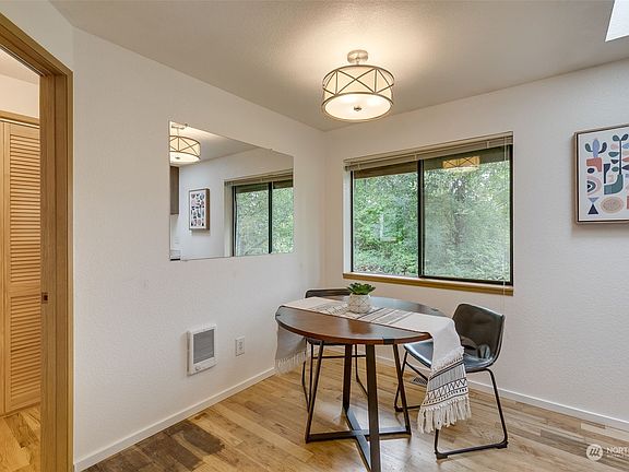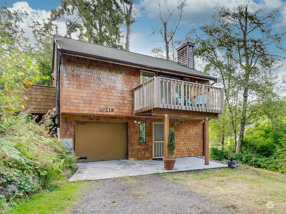 Tucked down a private drive among the trees is your quaint little hideaway. While surrounded by trees outside, there is great natural light inside with the skylight and all the windows. Main floor offers a 3/4 bath and versatile space perfect as bedroom, office, or play/hobby room. Hardwood floors throughout most of upstairs including the primary bedroom. Primary even has it's own private deck along with walk-in closet and full bath. Dining area next to kitchen with views into living room over the eating bar. Fireplace in living room and access to large deck to sit & enjoy the natural surroundings. 1 car garage along with parking for more vehicles in front.