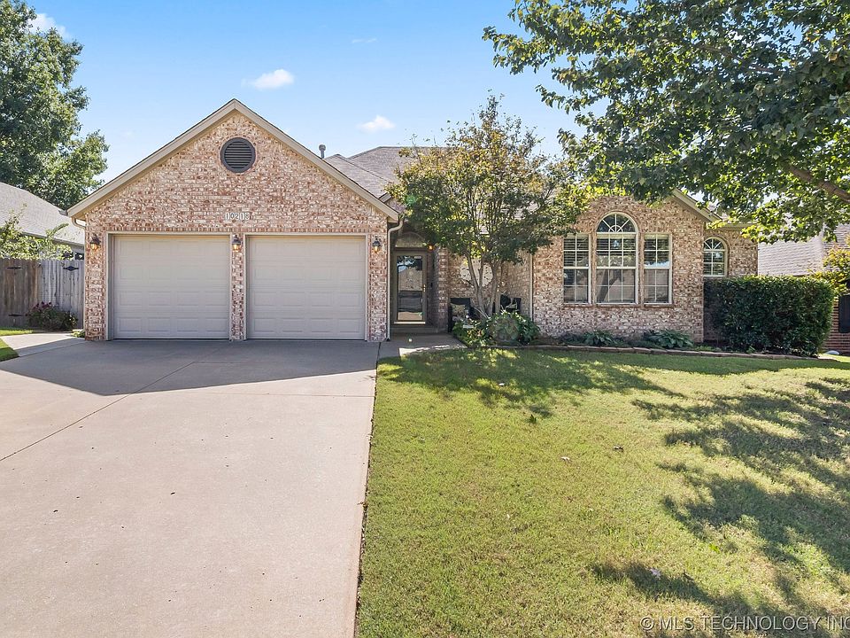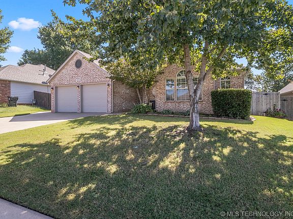 Popular The Park of Southwood in Bixby school district. This is a gardeners dream, backyard with new Arbor with swing, Jacuzzi Hot Tub, full privacy fence. Full brick home opens with wood floors into great room with a cozy brick fireplace, gas logs, gas starter and can be wood burning. Great room is open to Formal Dining. Kitchen features wood look tile floors, white cabinets, newer stainless appliances, gas stove island, pantry and breakfast nook. Split bedroom plan, Master En-Suite, with door to backyard, private bath, double sink vanity, separate shower and Jacuzzi Tub and large walk-in closet. Two separate bedrooms, bath and utility. Neighborhood park and walking trail. Close to shopping, dining and expressway.