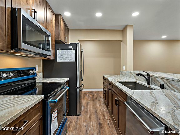 Looking for a Gorgeous condo in South Anchorage? Ground floor ranch style unit with a PRIVATE garage completely remodeled w/ new EVERYTHING! Gas F/P wrapped in granite, new window & sliding glass door w/ Hunter Douglas blinds. Kitchen opened up & all new slow close cabinets installed w/ Granite countertops. Bathroom transformed into a large walk-in shower. Large laundry room & all appliances stayNew Furnace, water heater & garage heater installed in 2020. Low HOA dues that include ground maintenance, snow removal, trash, water and sewer. Pets allowed. Plenty of guest parking! Lots of trails and parks throughout neighborhood. Easy walk to Fred Myers, Alaska Club or numerous restaurants.