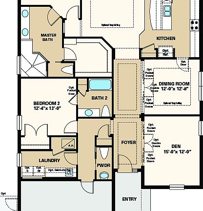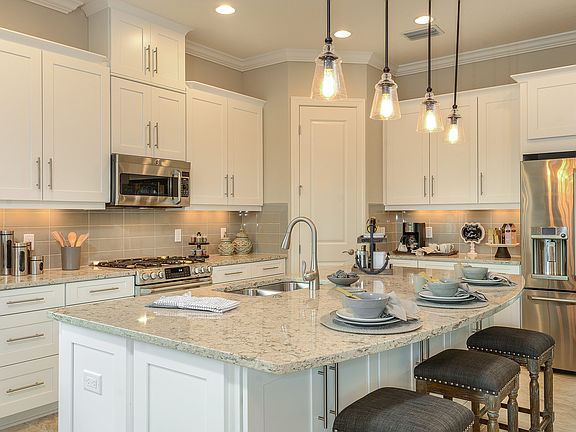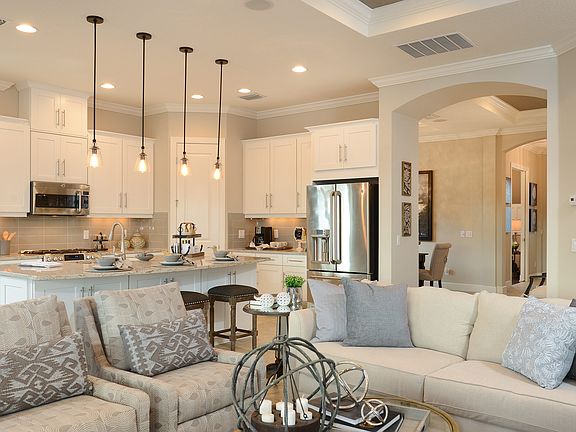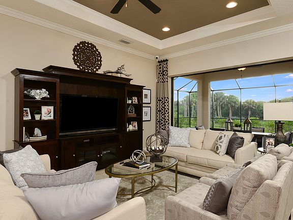 The Farnese is a 2,100 sq. ft. single-family home filled with flexible space options. The foyer leads to separate den and dining rooms which may be open or closed with optional double doors. The great room is adjacent to a designer kitchen with its own breakfast nook and spacious counter top island. The Master Suite includes a bay window, dual sinks, corner shower, water closet and walk-in closet. Additional space options includes an expanded covered lanai and additional garage area.