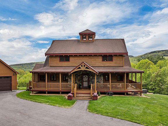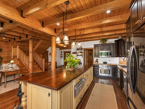Rustic Elegance Meets Mountain Serenity – Post & Beam Log Cabin on 28 Acres Escape to your private mountain retreat in this stunning Post & Beam log cabin, set on 28 secluded acres with breathtaking mountain views. This unique property seamlessly blends rustic charm with modern luxury. Step inside to soaring cathedral ceilings, exposed beams, and a chef’s kitchen featuring double-wall ovens, beautiful cabinetry, and a large island with a beverage fridge. The open-concept living area showcases a wall of windows framing panoramic views and opens to a wraparound deck—perfect for relaxing or entertaining. Stay cozy with a pellet stove and cool with a mini-split system. The first-floor primary suite includes a walk-in closet, bonus closet, and spa-like bath with a rain shower. Upstairs, you'll find two spacious bedrooms, each with en-suite bathrooms and walk-in closets, plus a loft area ideal for lounging or extra guests. The lower level features a dedicated office, game room, sauna, exercise space, and more sleeping room. Enjoy the outdoor hot tub under the stars or gather around the large fire pit. A 2-car garage and an extra building offer space for a studio, barn, or workshop. Perennial gardens and ample room for animals enhance the charm. Ideal as a full-time residence, vacation home, or income-generating retreat, this property offers unmatched comfort, space, and natural beauty.