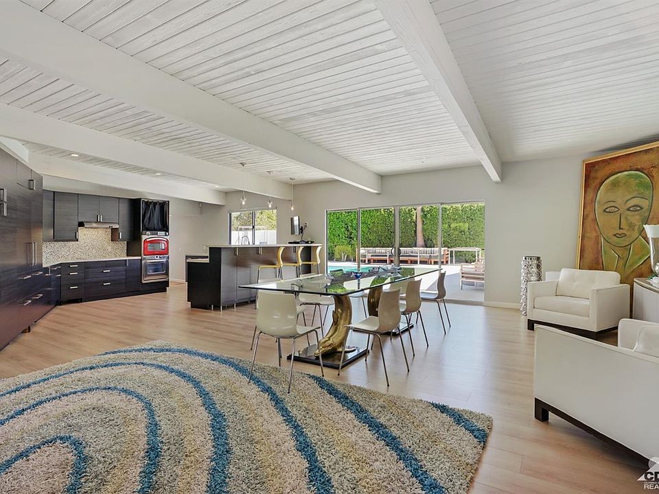 Turnkey Luxury Vacation Rental with 5 star rating and documented rental history. Sleeps 10 adults in comfort for reunions/family celebrations. Updated Mid-Century Modern home, located in the Movie Colony area with easy access to Uptown Palm Springs restaurants and shopping district. Large corner lot with views of the San Jacinto Mountains. Distinctive split-wing plan features a "Grand Salon" with vaulted ceiling, living, dining and entertainment areas. Remodeled kitchen includes integrated cabinet paneled Sub-Zero Refrigerator, separate Sub-Zero Freezer, Miele dishwasher, white quartz counters and breakfast bar. South wing features Two Master suites. North wing includes one oversized bedroom (20x30) currently being used as a cinema, plus an additional guest room. The bathrooms have been updated and have a professional "spa" appeal. Kidney shaped pool is sparkling and inviting with multiple lounging areas, large grass areas all hidden behind the wrap-around ficus hedge.