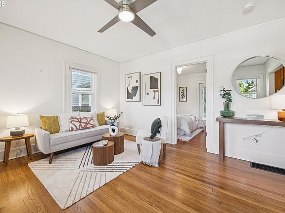 Bungalow beauty in the Alberta Arts District. Beautiful original hardwood floors throughout the home. Both bedrooms have outdoor deck access. Original claw foot tub adds a special vintage touch. Brand new roof in June of 25! Upgrades include updated plumbing, electric and HVAC. Double pane windows for efficiency. This home scored a 10 on the energy score. The large driveway can accommodate 2 cars and has a dedicated covered entrance to the house. Relax in your spacious back yard with a light filled covered patio and raised garden beds ready for your green thumb. The yard is fully fenced and ready for Summer activities. Large basement with tall ceilings is the perfect canvas for an office space or movie room. Convenient to restaurants, shops, and public transportation. **Open House 11-1 on Saturday 7-12. [Home Energy Score = 10. HES Report at https://rpt.greenbuildingregistry.com/hes/OR10189841]