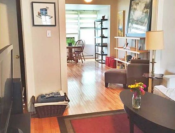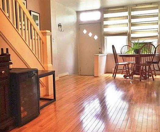 Very cute row or townhome in prime location. Large open space between living and dining rooms. HW floors throughout. Cheerful eat in kitchen with white cabinetry and stainless refrigerator. Covered rear porch and small fenced yard for garden or pets. Two off street parking spots behind home. Alley access to parking. Two nice size bedrooms with smaller captive bedroom. Possible uses are office, large walk-in closet or private TV area. Large useable basement for storage. Bright and pleasant space.