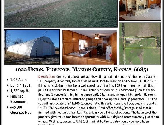 Come and take a look at this well-maintained ranch style home on 7 acres. This property is centrally located between El Dorado, Newton and Marion. Built in 1961, this ranch style home has been well cared for and offers 1,232 sq. ft. on the main floor, plus a full finished basement. There is plenty of room with 3 bedrooms (1 on the main floor and 2 nonconforming in the basement), 2 baths and an open kitchen/family room. Enjoy the stone fireplace, attached garage and hook up for a backup generator. Outside you will appreciate the 44x100 Quonset hut with partial concrete floor, electricity and a 15'6''x13'6'' overhead door. There is also a 13x81 office/hobby/storage shed that is finished with heat and a half bath that gives you all kinds of options. The balance of the property gives you some income opportunity with 4.14 dryland acres currently planted to wheat. With easy access to US-50, this might be the country home you have been looking for!