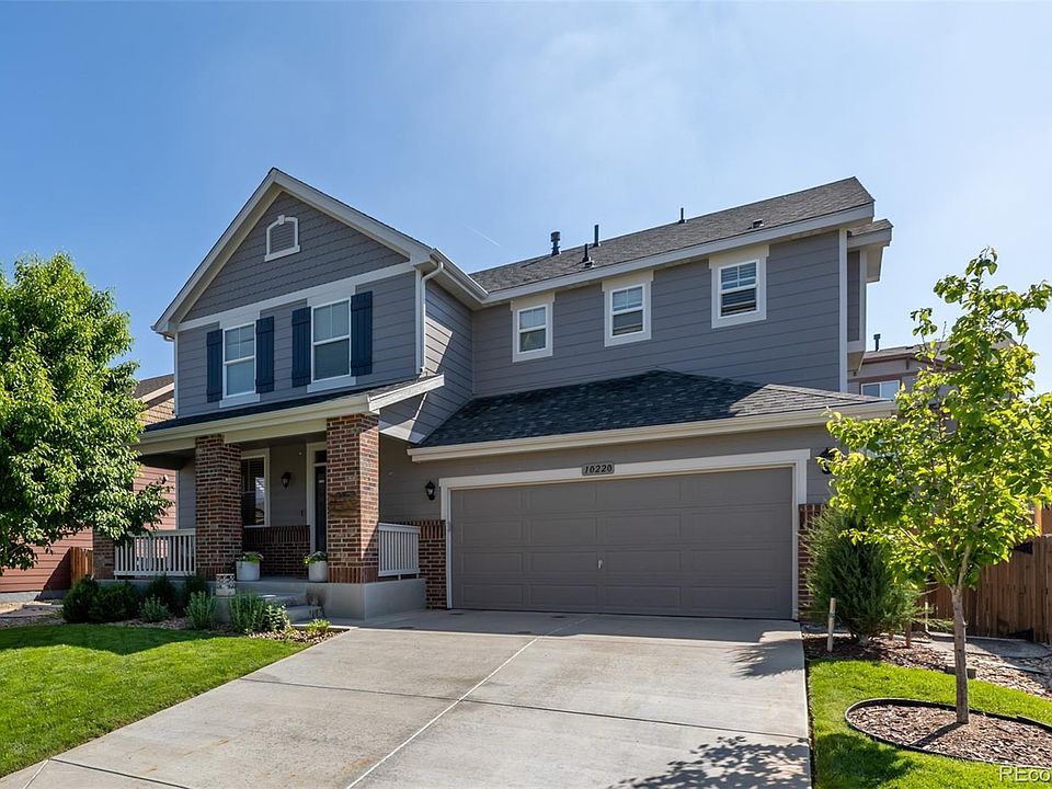 Presenting an exquisite, move-in ready home on a sought-after west facing lot! This stunning two-story home offers 3 beds, 3 baths, a main level office area, granite countertops, and stainless steel appliances. This meticulously maintained home has been thoughtfully updated and enhanced with new fireplace tile surround, accent barn wood wall, tiled accent wall in the powder bathroom, and charming wallpaper in the primary bathroom. Unwind in the primary suite, boasting vaulted ceilings, a luxurious 5-piece bathroom, and a large walk-in closet. Additionally, the second floor accommodates two well-sized bedrooms and a convenient laundry room. Enjoy serene moments on the covered porch or covered back patio. The unfinished basement provides potential for expansion with high ceilings and plumbed rough-ins. This home's curb appeal has been elevated by its freshly painted exterior and beautiful landscaping. You'll love the nearby open space, parks and miles of trails. Conveniently situated near E-470, DIA, restaurants, and shops, this is an opportunity not to be missed!
