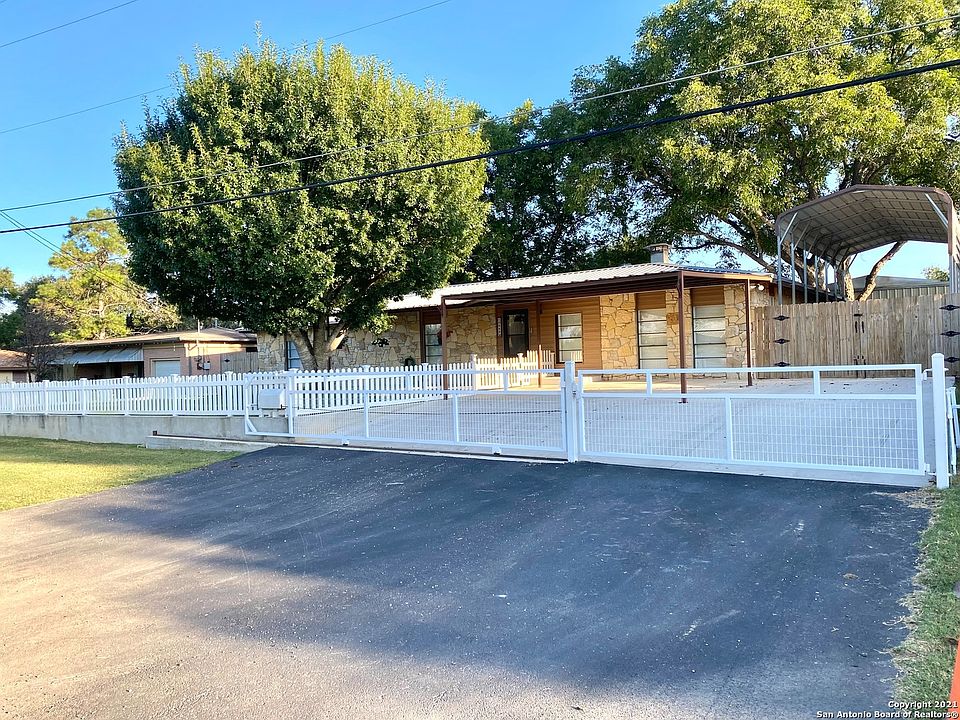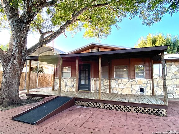Texas ranch style home in Adkins welcomes you with pine walls and a wooden stove, custom cabinets, stainless steel appliances. This home has so many thoughtful details, an intercom system, double pane windows, storm doors. Huge workshop in back, lots of cabinets, an extra room for storage and a loft for more storage. A covered patio to entertain rain or shine, has a sink, stove and refrigerator, privacy fence in back. New metal roof installed Dec 2020. Plenty of room for your RV with 110 hookup. Minutes away from Brooks City Base, The Pearl, Randolph AFB, Forum.