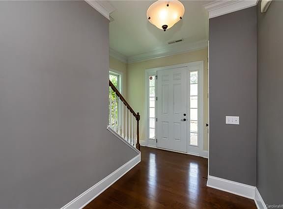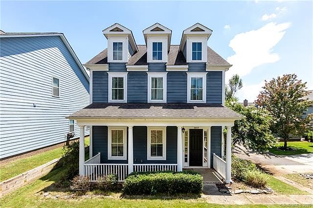 This gorgeous home, only minutes from Carolina Place Mall and Pineville's Main Street, has numerous upgrades that truly make it a showpiece in the area! Gleaming wood floors flow not only throughout the downstairs, but also in the upstairs loft area. High ceilings are accented by beautiful crown molding, which is mirrored by the staggered height cabinets in the kitchen, with granite counters, and a contrasting color island with bar seating. The spacious master suite has a classic double trey ceiling, with custom cabinets including center tower storage and granite counter, and an oversized tile walk-in shower. Relax with morning coffee or an evening cocktail on the private master balcony, or the charming covered front or side porches. The two-car garage is back-loading, preserving the Arts & Crafts style character of the home for maximum curb appeal.