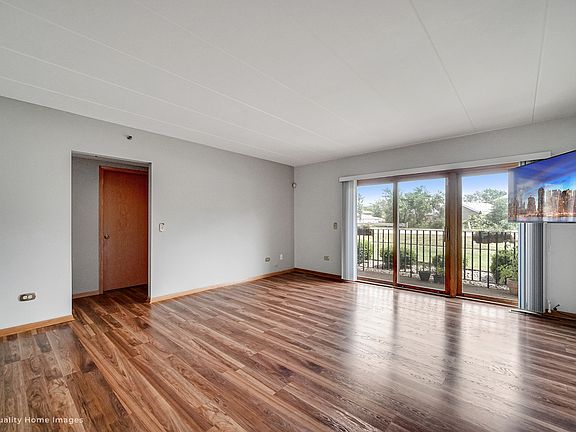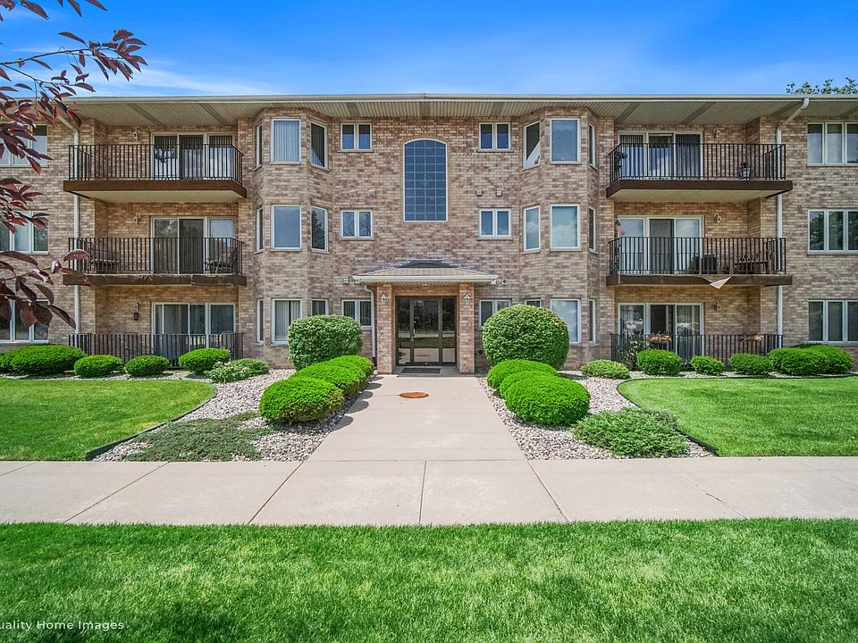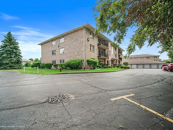 This extra large 1300 square foot 2 bedroom and 2 bath condo on the first floor offers it all with an extra large eat-in kitchen plus a separate dining room. In unit laundry room with utility sink and built-in cabinets. Central AC and heat. One car detached garage with several parking spaces in a private drive. Walk-in closet in master bedroom. Kitchen offers plenty of oak cabinets and a separate pantry. Fresh paint and laminate flooring throughout. There are several windows that bring in plenty of natural light. Also, beautiful area in the back of the middle building for family gatherings and barques too! Don't miss this opportunity to own your own condo! Metra station and shopping mall are within walking distance!