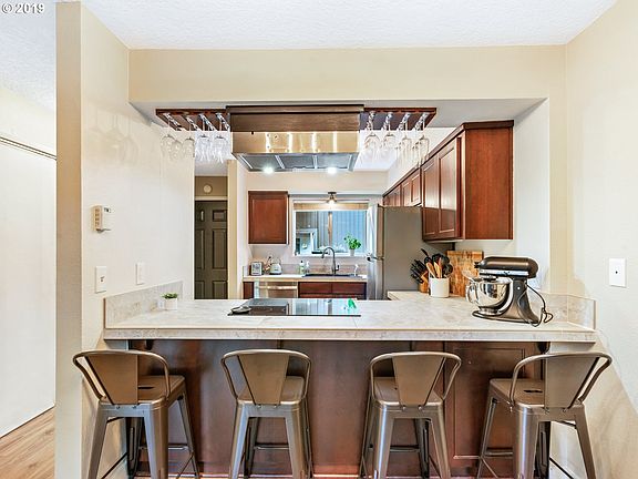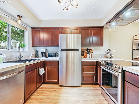 Exceptional 2bed/1.1bath move-in ready end unit condo. Light & bright w/high ceilings and beautiful laminate floors throughout. Updtd kitchen with SS appliances and eat-up bar opens to large living room with cozy fireplace. Perfect for entertaining. Upstairs features private balcony, vaulted ceilings and spacious mstr with dbl closets. Fenced yard with fire pit and room to garden. Near 217 and busline for easy transit. Welcome home.