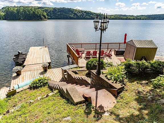 Immaculate year round home/cottage on popular Three Mile Lake! Custom built in 2007 w/over 3,300 sq ft, loads of features & an abundance of wonderful indoor & outdoor living spaces making it the perfect place for friends & family. Wonderful 0.51 acre lot w/120 feet of frontage, great privacy & gentle walk to the lake offers easy access for all ages with shallow & deep water swimming. Stunning open concept design featuring; soaring cathedral ceilings, breathtaking living room w/propane fireplace, custom built-in shelving/mantle & floor to ceiling windows overlooking the lake w/walkout to a huge wrap around deck. Gorgeous custom kitchen has loads of cupboard & counter space with granite counter tops + formal dining area w/walkout to deck. Main floor bedroom, main floor laundry & 4pc bath. 2nd floor offers an exclusive primary bedroom suite w/gorgeous lake views, walk-in closet & 3pc en-suite. Full finished basement offers an additional 1,300+ sq ft of living space including a large & inviting rec room w/fireplace, 3 season Muskoka room w/walkout, 2 bedrooms, 4pc bath, office & storage room. Awesome on water patio/sun deck w/shed at the lake + large floating dock w/deep water for the boat & shallow beach swimming area at the side. Detached double garage, backup generator, High Efficiency Propane heating, central air & much more!