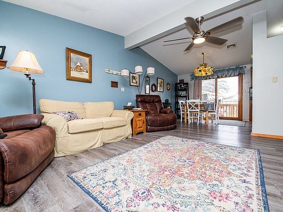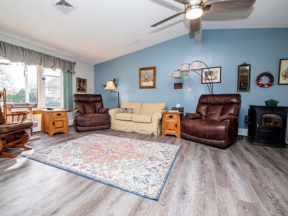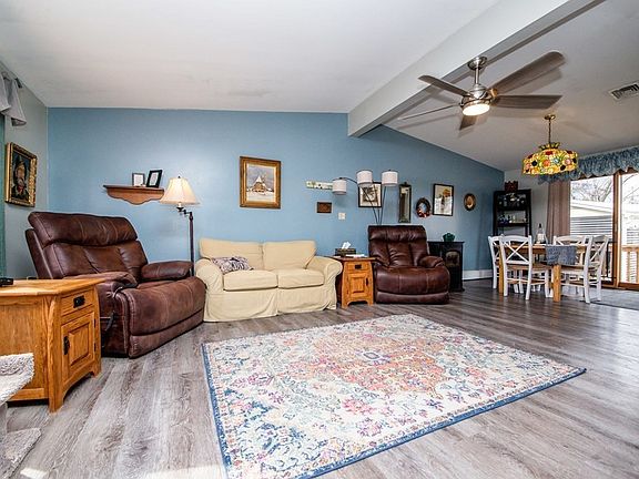 Lovely Ranch nicely maintained with updated kitchen, remodeled bathroom which has washer/dryer hookup and . Cathedral ceilings in living room, dining area and kitchen.3 good sized bedrooms 2 with walk in closets. All hardwood floors throughout. Two finished heated rooms in the basement perfect for entertaining. Central air. Carport is portable. Large driveway and fenced in yard. Leased solar panels. Awnings for front windows and back patio. On demand hot water. Kitchen appliances are 1.5 years old. Ready to move into.