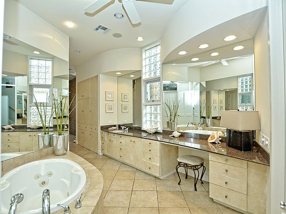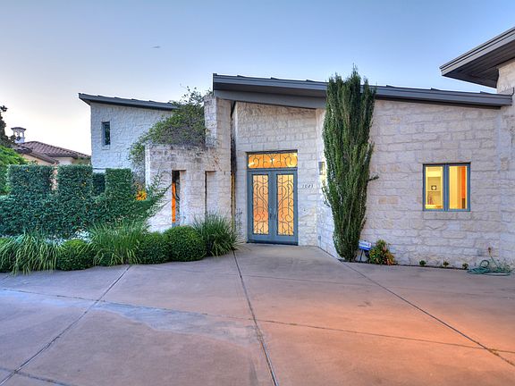 Contemporary Waterfront Home sitting on 250 Ft of Lake Travis. Amazing views of lake and hill country from walls of windows. Negative Edge Pool/Spa. Deep-Water Cove w/1500 SF dock. Updated Gourmet Kitchen with Quartz counter. Full Bar with Wine Closet. Pecan Floors though out main level. Master overlooks lake with updated Spa like Bath w/outdoor Shower and Exercise Loft. 4 bedrooms down with game room. 1850 SF of Covered out door living, fire place, grill and views. Golf cart path down to water.