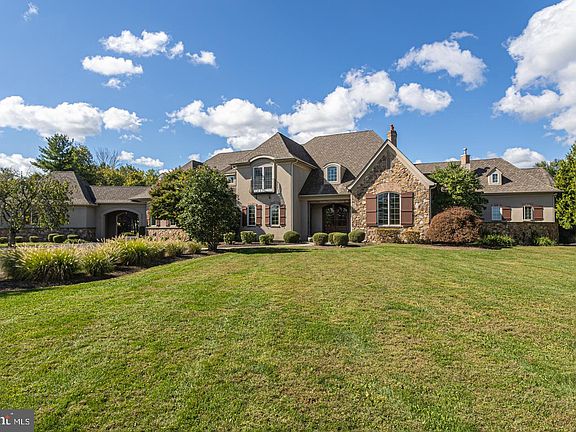 Escape to this exceptional French Country Manor home resting on 3+ acres of prime Bucks County tree-lined landscape and overlooking 178 acres of deed restricted land in Upper Makefield. Its curb appeal and architectural charm draws you in instantly to explore what the rest of this alluring estate has to offer. Enter through double arched mahogany wood doors which sets the tone as you walk through this thoughtfully appointed 5-bedroom home with hardwood floors, 5 fireplaces, stunning millwork, attractive moldings and 10’ ceilings. The forged iron and wood spiral staircase brings a classic elegance and ornate style into the open entry as it winds its way to the lower and upper levels as well as the overlook. The home’s layout offers a charming blend of formal and informal spaces including a stylish living room with a multi-arched column accented entry and coffered ceiling, dining room with convenient butler’s pantry, an expansive designer kitchen outfitted with granite countertops, Wolf cooking appliances, SubZero paneled refrigerator, 2 islands highlighting a large farmhouse sink, cooktop and multiple freezer drawers, separate eating area and coffee bar nook with Miele espresso maker. The kitchen flows easily into the warm and inviting gathering room with a vaulted ceiling, grand statement chapel beams, fireplace, magnificent transom highlighted French doors offering views of the luscious backyard landscape and four access points to rear patio areas and a relaxing covered porch area. A spacious cherry wood paneled study with built-in cabinetry, fireplace, and gorgeous matching arched double doors that can be closed for that much desired privacy make working at home here seem easy. The main suite is conveniently located on this level and offers a deep tray ceiling, a cozy sitting area adorn with fireplace, and multiple French doors leading to private bluestone terraces inspiring tranquility. The main his/her bath is luxurious with a sizeable double-sided steam shower, raised whirlpool tub surrounded by a curved wall of windows allowing for natural light, an extra shower, and multiple custom vanity areas offering plenty of room making it the perfect retreat to de-stress and soak in. Two powder rooms, a drop zone and a roomy laundry/mudroom complete this level. The upper level features 4 generously sized en-suite bedrooms, one large enough to serve as an in-law/au pair suite with separate living space containing a sitting room, full bath and stunning kitchenette. Also on this level are two bonus rooms, one with an attached half bath, which provide endless possibilities such as a craft room or playroom. The fully finished walk-out lower level is impressive and provides a full-size bar complete with wine fridge, ice maker, kitchenette and center island, recreation area, fitness space, multiple storage areas, sitting area with fireplace, billiards zone, movie theater room, and full bath for that much sought-after additional entertainment and living space. The basement also offers direct access to the garage via a rear staircase. The outdoor amenities are just as spectacular as the inside featuring a pool, soothing spa, multi-level bluestone terrace accented by a grill area and plenty of lounging areas for relaxation and hosting guests. Additional amenities include an elevator servicing all three levels, central vac, attached 3-car garage and covered walkway to an additional attached 2-car garage all boasting the arched mahogany doors to mirror the home’s front entrance. All perfectly located in Council Rock School District with easy access to I-295 for travel to Philadelphia, Princeton and NYC.
