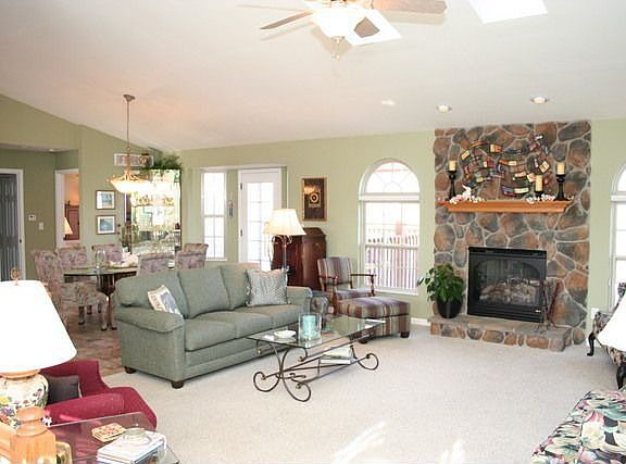 This is an absolutely stunning home with a breathtaking view of the lake from the deck and most rooms of the home. Upgrades throughout entire home from ceramic floors in kitchen/baths to stamped patio/well maintained deck with pergola. Very open floor plan with vaulted ceiling that extends from living room to kitchen. The living room has a stone gas fireplace, skylights and a plant shelf with light switch to work the outlet. The kitchen has staggered oak cabinets with crown molding (lighting underneath cabinets), some with glass fronts, wine rack, stainless steel appliances, breakfast bar and a beautiful ceramic floor with a slate like appearance. This flooring extends into the dining area which then walks out to the deck. This home has a split bedroom plan with 2 spacious bedrooms on the right side of the home and a luxurious master suite with his/her closets on the other side of the home. The master also has a large garden tub, dual vanity and separate shower. From the 3 car garage with access door, you walk into the laundry room with a utility sink and large closet. In the walkout basement you will find a family room, office area, bedroom and full bath. There is lots of storage in the basement as well as a water softener and high efficiency furnace and water heater (new in '09). The doors in the office lead to a stamped patio, herb garden and fabulous view and yard. The utilities in this home are very reasonable. They average $228 a month including water, sewer, trash, gas and electric. There are 1768 square feet above grade and 1100 square feet below grade for a total of 2868 square feet. "LIVE TOUR" http://www.youtube.com/watch?v=C2wqxxGqdVE For an audio description of this property, call 1-800-239-2519. The property number is #2023 Don't forget...buy or sell with me and use my moving truck to move fo