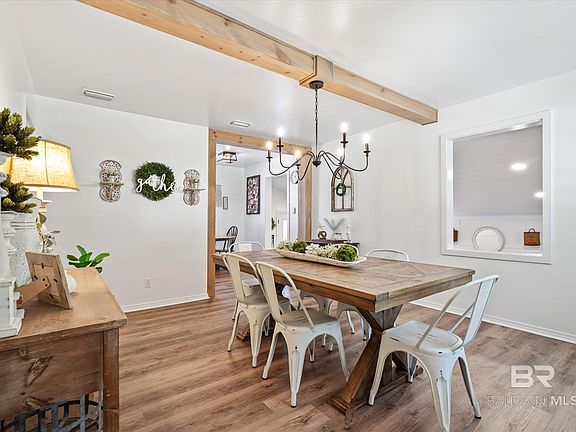 Priced to sell in Saraland, with just under 1600 square feet, and so adorable. Yes, it has 1 bath, but it’s a fabulous bathroom with a double vanity and quartz!! This adorable home features custom wood beams and luxury vinyl plank (LVP) flooring throughout the entire house. In the sunken family room, you’ll notice the wainscoted walls and white shiplap ceiling. Cooking will be so much fun in this fabulous kitchen that boasts a custom wood range hood, quartz countertops, new white cabinets, and a stylish subway tile backsplash. Another unique feature is the antique swinging door with brass hardware and a spring-loaded hinge that leads from the kitchen to the laundry room. The utility room and large bathroom are adorned with beadboard walls, while the bathroom also offers white quartz countertops and a double vanity. Situated on a half-acre lot, the property includes a storage shed and is shaded by large, beautiful trees. Don't miss out on this enchanting home – call for your showing today! Buyer to verify all information during due diligence.