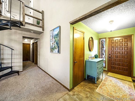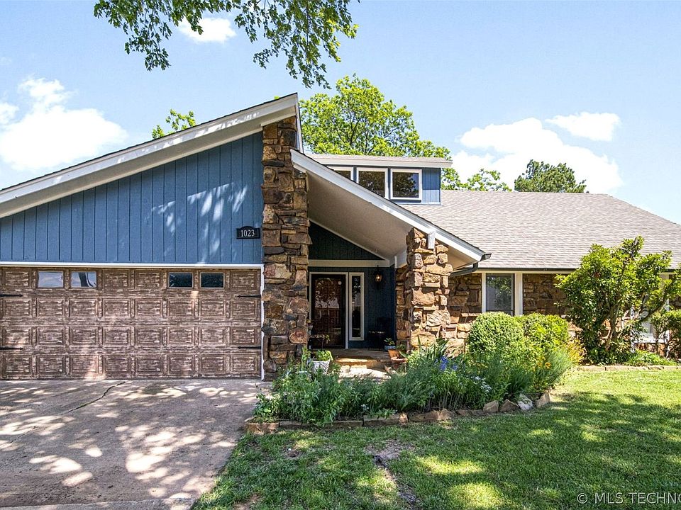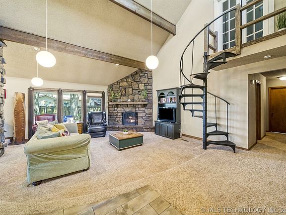This contemporary gem in the heart of Jenks school will blow you away! Vaulted ceilings with architectural stone columns & fireplace. Open layout features living room w/lots of natural light. Plus a large kitchen w/built-in island & lots of cabinet storage. Spacious primary bed w/full bath attached, plus sliding doors to backyard. Two guest rooms w/built in desk downstairs. Large laundry room with folding area & storage closest. Beautiful spiral staircase leads to 4th bedroom or game room. Newer HVAC & exterior/interior paint. Well maintained. Corner lot w/mature trees, big backyard & a parking pad for trailer or RV. Peaceful backyard has a pollinator garden that brings butterflies & birds. Close to downtown Jenks, blocks away from Jenks West Elementary. Across from Jones airport. Very centrally located to everything Jenks has to offer!