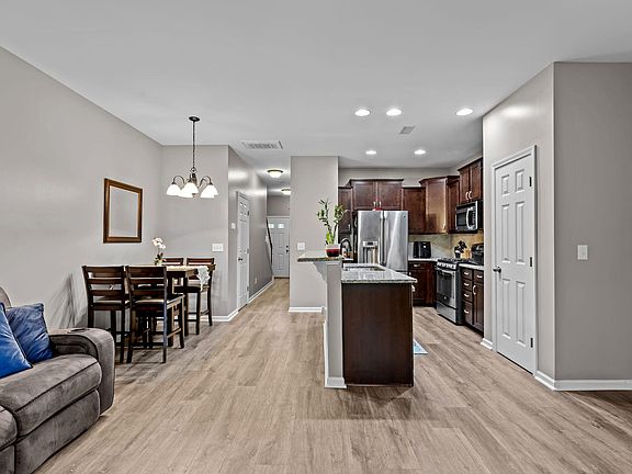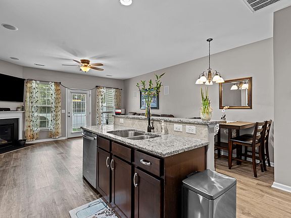 Discover the charm of living just under 5 miles away from the heart of Raleigh! Presenting a delightful 2-bedroom, 2.5-bathroom townhome with a single-car garage, nestled in the vibrant Renaissance Park neighborhood. The ground level has LPV flooring, a convenient powder room, and a generous kitchen space featuring stainless steel appliances, a natural gas stove, and elegant granite countertops. Enjoy the warmth of a natural gas fireplace in your living area. The carpeted second level offers two expansive bedrooms, each with en-suite bathrooms. All flooring was updated just 4 years ago. Experience an integrated speaker system throughout the residence and the efficiency of a tankless water heater. Step outside to a serene sitting area overlooking a lush treeline, perfect for relaxation. Don't miss out on this exceptional living space!