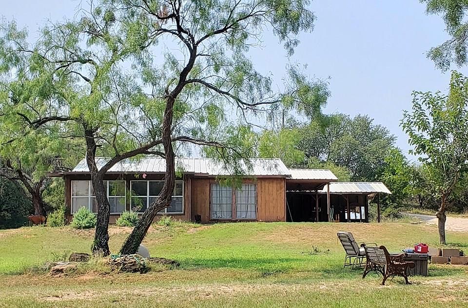 OAK CREEK LAKE HOME FOR SALE ON 2 LOTS! Check out this quaint lake cabin nestled in a secluded area of Oak Creek Lake, surrounded by mature Oak and Mesquite trees. With about 2 acres, this property offers a ton of outdoor space and possibilities. It includes storage buildings, a detached carport with storage, a well house for the new well pump, and an attached carport as well. This 2 bedroom home has 952 sq ft of living space (per CAD), and offers an open concept living room/kitchen. There is plenty of kitchen cabinetry, appliances are included, and a large kitchen island offers a great space for dining with barstools included. There is ceramic tile throughout the home, the living room and a bedroom have recently been painted; the home includes central heat/air and is all electric. One bedroom has a washer/dryer nook built in, and the appliances stay. The sunroom needs work, but is perfect for a game room or sitting area. Call for more info and to schedule your showing. Leasehold land!