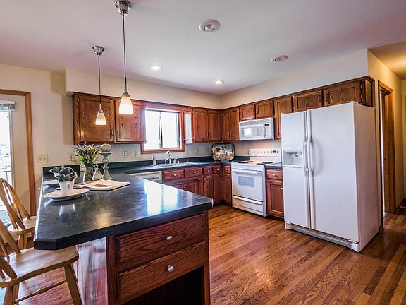 SPECTACULAR VIEWS and 130' OF LAKESHORE WITH DOCK 4-5BR,3.5BA walkout,formal LR & DR,open Kitchen-Bkfst-Hearth Rm w/new granite counters,gas fireplace,hardwood & deck access,Util Rm. Upstairs MBR suite w/balcony,2BRs,BA. Lower level in-law suite w/full 2nd kit,Family Rm(wood-burning fireplace),large BR,huge Rec/Play or 5th BR,BA. 3-sides brick,brand new roof,mature trees,brick patio,shed,warranty.