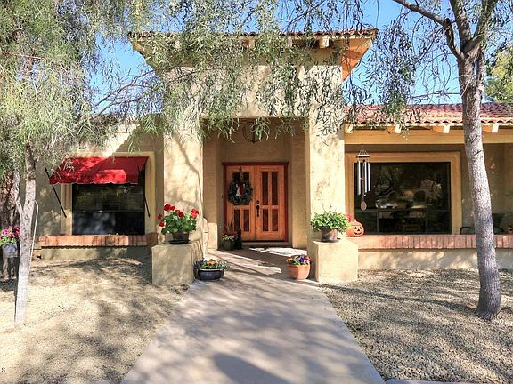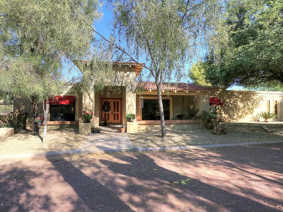 RARE North Scottsdale find just shy of an acre. Wonderful 5 bedroom 3 bath Arizona property on quiet, tranquil street with lots of room to roam. Circular drive invites you to enter with a large covered patio entry and custom double door Beautiful custom hand scraped wood flooring in all the main rooms. Split 5th bedroom & bath could be a very private office or playroom. Plenty of storage. Spacious dining room, living room and family room for enjoyment. Two wood burning fireplaces, lots of windows, doors to look out at both green and desert surroundings. Huge patio overlooks pool with lush grassy backyard and trees wonderful for sitting,relaxing and great for entertaining. Just imagine the possibilities for the side yard. No HOA Just PERFECT!!