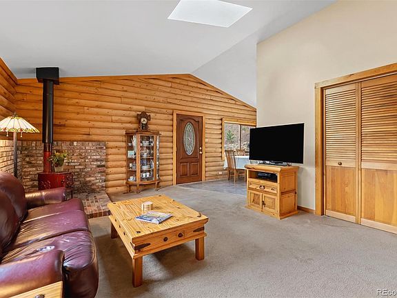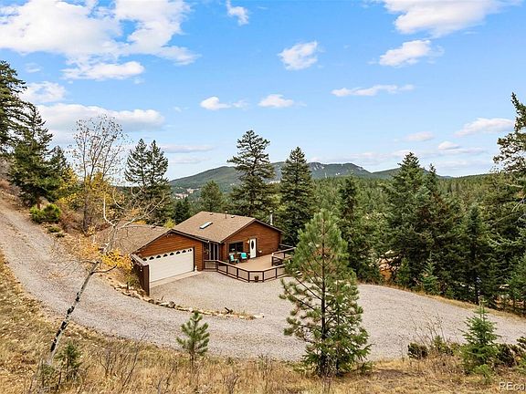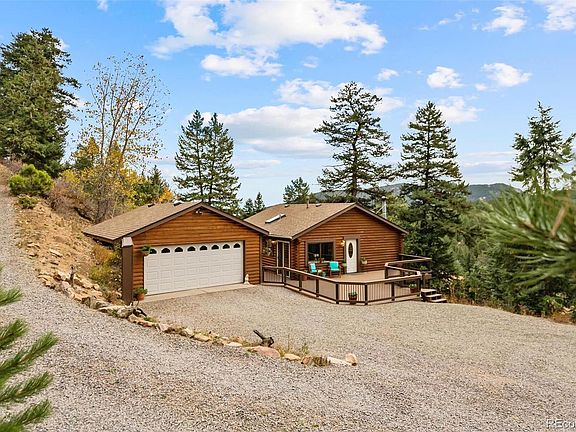 This Colorado log style home exudes charm and comfort. The main floor is open and lives large with vaulted ceilings and generous sized windows to take in distant mountain views. The kitchen is well equipped with newer appliances, plenty of storage and open to the dining and living area. Step out the door and enjoy the pristine, sun-drenched TREX deck for additional outdoor living space. Two nice sized bedrooms on the main level share a freshly updated full bath with tub/shower glass door enclosure accented with a skylight to bring in the natural light. Stoke up a fire in the treasured heirloom wood burning stove. The lower level is light, bright with large sunny windows, 9' ceilings, and has been recently finished. It could be used as a master suite or separate living quarters as it has a private walkout exterior entrance. The bathroom finishes are exceptional and is open to a customized walk-in closet. Enjoy a focal point gas fireplace in the bedroom. The additional living room is great option for media/office/gym. Super clean utility room with extra storage and doubles as laundry room. The 2 car garage is just steps from the kitchen sliding glass door for easy grocery unloading. The home is perfectly situated for optimal sun light throughout the day and surrounded with native landscape. Gentle gravel driveway leads way to spacious, sunny and level area for extra parking. Just a short distance to hiking, biking, Flying J Ranch, minutes to Conifer amenities and public transportation. Easy commute to Denver. Newer roof, meticulously maintained and ready for new owner. Blue Sky Trail has a shared road maintenance agreement for the paved portion of the road. The gravel portion of private driveway is maintained by owner and is shared with one other homeowner. Septic size is for 2 bedroom/4 people. Use legal description from deed recorded Recorded Deed dated July 15th, 1992, Reception No. 92088648.