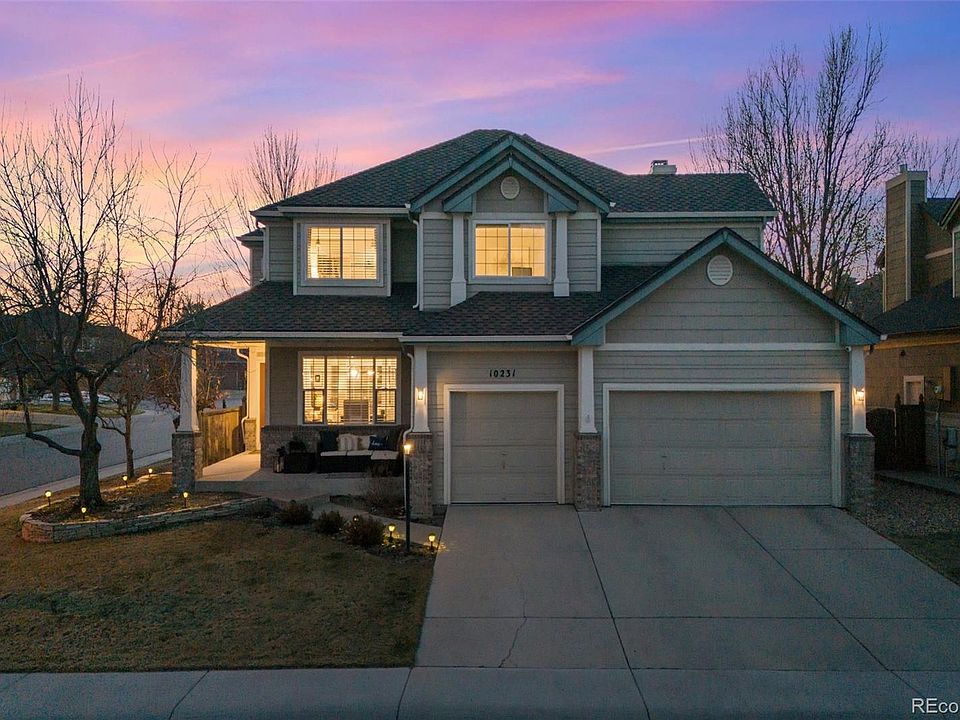Welcome to 10231 Hedge Lane, nestled in the heart of Parker, CO! This delightful 4-bed, 3-bath abode exudes warmth and cheer as you step inside to discover a haven of happiness, where sunlight dances through every window, illuminating the airy interior. The heart of this home is its spacious living areas, perfect for hosting gatherings with loved ones or enjoying quiet moments of relaxation. Imagine cozy evenings by the fireplace, laughter-filled dinners in the elegant dining room, or lazy afternoons lounging in the sun-soaked family room. The kitchen is a chef's dream, boasting modern appliances, ample counter space, and a charming breakfast nook bathed in natural light. Prepare delicious meals while soaking in views of the lush backyard oasis, where a tranquil deck awaits for al fresco dining and summer BBQs. Retreat to the blissful bedrooms, where soft carpets and soothing colors create a serene ambiance conducive to restful nights and rejuvenating mornings. The primary suite comes complete with a luxurious ensuite bath and a walk-in closet fit for royalty. With 3 more bedrooms across from the primary and a full bathroom, there is plenty of space for your home office, gym, and guests galore! Complete with a fully finished basement and a 3-car garage, this home provides enough storage for all of your winter and summer toys & decor! Conveniently located in a friendly neighborhood near top-rated schools, parks, and amenities, 10231 Hedge Lane offers the perfect blend of tranquility and convenience. Come experience the joy of living in this charming and happy home – where every moment is filled with smiles and memories waiting to be made! Schedule your showing today!