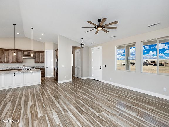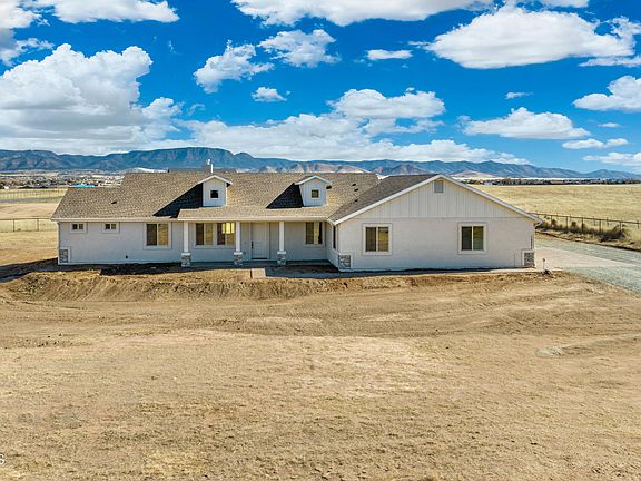 A beautifully built, new construction, open-plan concept home on an elevated 2.06 acre parcel in a corner lot with panoramic views, including Granite Mountain, Thumb Butte, Glassford Hill, and the Bradshaw/Mingus mountain ranges. On entry you walk into a massive great room with vaulted ceiling (ceiling fans throughout) and gorgeous wood-grain plank tile flooring that extends through the entire property, excluding the bedrooms. Prewired for TV above the welcoming stack stone fireplace. Access to the expansive rear covered patio, plumbed for a gas barbecue. The kitchen features stunning alder cabinetry with soft close doors and drawers, under-cabinet lighting and gleaming granite countertops. The stainless steel appliance package includes an LG ThinQ refrigerator and NXR six-burner range
