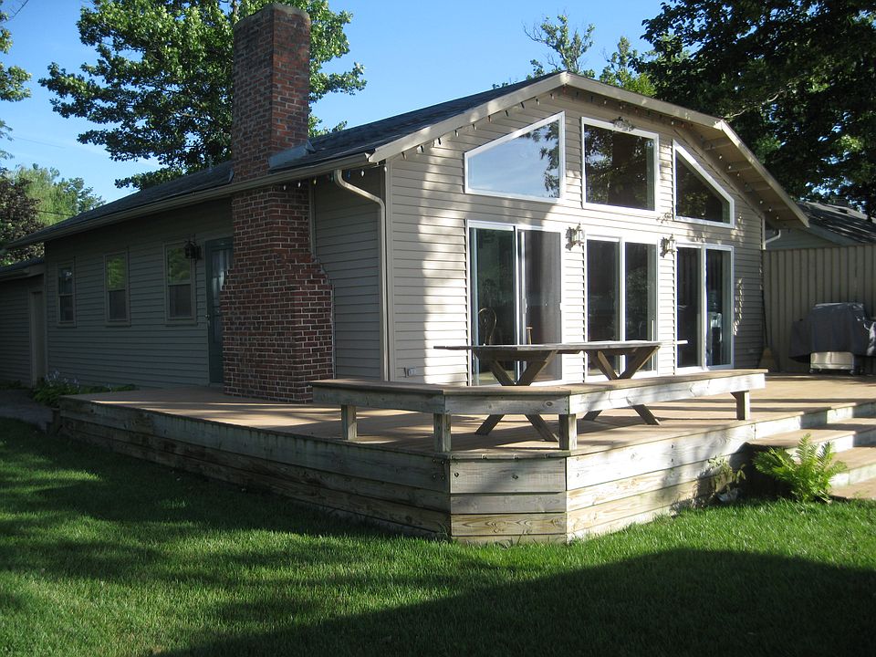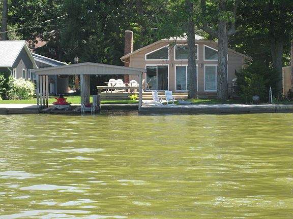 Lakefront cottage house on main lake but protected by Pew Island State park. Major remodel in 2005 with uplifted ceiling, new windowed lakeside wall, kitchen upgrade, large deck and sidewalks, central heat and air conditioning, two bathroom upgrades, siding, floors refurbished, boat lift in roof covered boat well.