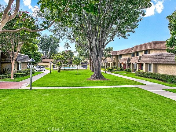 Travel the winding roads of Tiburon to the end of the Shenandoah cul-de-sac and venture down the greenbelt to a walkway lined with dwarf palms to this comfortable 3 bedroom 2.5 bathroom townhome. Walk through the red door to the living room with its rich laminate flooring and custom base and crown moldings. Take the hallway past the guest powder room to the kitchen which boasts refaced cabinets, Corian countertops, recessed lighting, a built in microwave and loads of storage including a walk-in pantry with pull out shelves and built in china cabinets. Outside there is a brick paver patio with block wall fencing and an orange tree. It leads to a 2-car garage that has washer & dryer hookups, upper storage and a workbench. Upstairs the spacious master suite is reconfigured from the original floor plan to have a showcase primary suite bathroom and a nice view of the greenbelt. The full bathroom upstairs is also beautifully remodeled. This home features 6 panel doors, dual pane windows, wood banister, central air conditioning, water softener and ceiling fans in every bedroom. Tiburon offers its residents 5 pool areas, 2 clubhouses, playgrounds, open spaces, walking trails and mature trees. It is located near hospitals, shopping, restaurants, Mile Square Park recreational facilities, golf courses and about 5 miles to the beach. All this and award winning Fountain Valley School District! Welcome home.