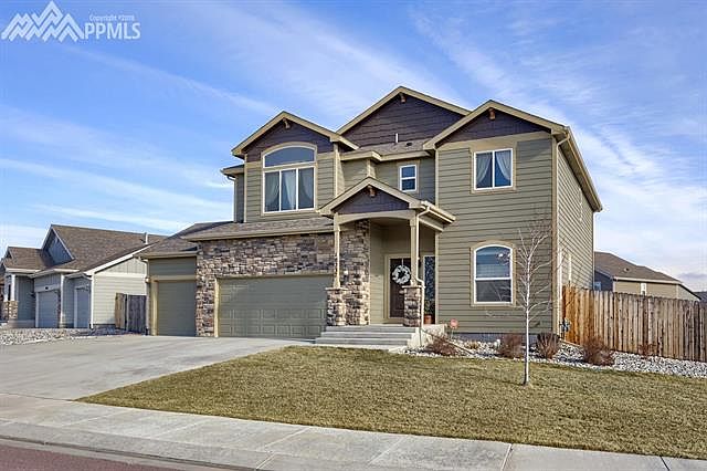Immaculately maintained home with a 3 car garage and covered front entry-this home has 4 bedrooms, 4 bathrooms with a formal dining room, fully finished basement, central a/c, humidifier, fully landscaped with fenced in back yard and stamped concrete patio. Built in gas to the fire pit and space for the hot tub which is negotiable, sump pump, sprinkler system, gourmet kitchen with large island, stainless steel appliances, granite, butlers pantry and 2 story living/great room are just some of the features of this beauty! Home is conveniently located near Ft Carson, Peterson Air Force Base and Shriever. Fully landscaped-to include apple and plum trees in the back-with a 3 car garage you walk in and immediately see a formal dining room with hardwood floors that extend into the kitchen. There are French doors and a pass through to Butlers pantry into kitchen complete with granite countertops. Kitchen is gourmet with stainless steel appliances, espresso cabinetry and a large island with plenty of storage and room for bar stools. The Great room is 2 stories with plantation shutters covering the windows and a custom gas fireplace with granite tile surround. Walkout to the fenced in back yard complete with stamped concrete patio and built in gas to fire pit as well as a perfect spot for the hot tub. There are 3 Bedrooms upstairs plus a loft, full bathroom and laundry room with cabinetry for storage. The master retreat has a view of Pikes Peak, vaulted ceilings, a double sided fireplace and walk in closet as well as a 5 piece bathroom. The basement is finished with the 4th bedroom and full bathroom as well as 2 separated living spaces. Home is available for rent back depending on time. Community is building a new school that should be completed by 2019. A must see!