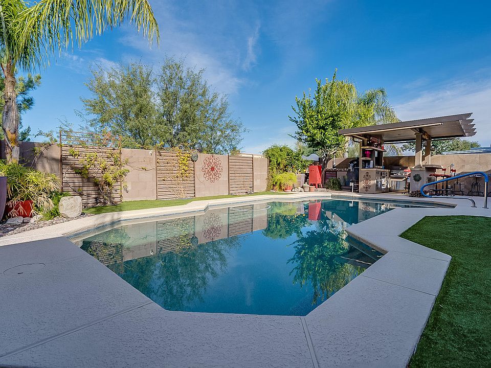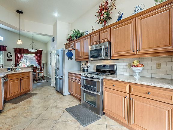 Move in ready! Beautifully maintained and upgraded 3 bed/2 bath single story home with a den/office. The home features 2 amazing outdoor entertainment spaces, a lovely front courtyard and resort style backyard with solar heated pool, outdoor kitchen and mountain views. Open floor plan with upgraded tile throughout and high vaulted ceilings. Kitchen is remodeled with plenty of cabinet space, stainless steel appliances, gas stove, quartz counter tops and breakfast nook with bay window for natural light. Double doors lead you into a relaxing and spacious master bedroom. Master suite includes dual sinks, shower and walk-in closet. Has whole home water filtration system. Located in Vail school district with many top schools with walking distance. Close to shopping, TIA, Raytheon, and