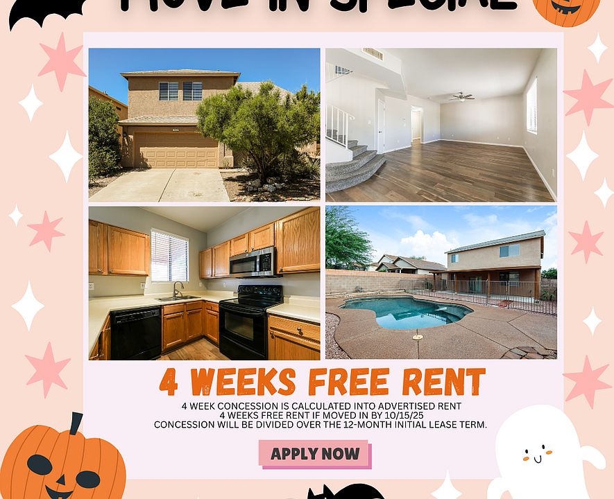 Simona Bell RECEIVE A FREE IPAD OR 55-INCH TV IF MOVED IN BY 10/15 Don't rent from Wall Street rent from Atlas where you are a person, not a number! We believe in helping our residents become homeowners and investors with our Uplift Program! 4 WEEK CONCESSION IS CALCULATED INTO ADVERTISED RENT OF $1,703 4 WEEKS FREE RENT IF MOVED IN BY 10/15! Concession will be divided over the 12-month initial lease term. Restrictions apply and this offer is subject to change or cancellation Welcome to 10237 E Desert Skyline Way, Tucson, AZ 85747 3 Bedroom, 3 bathrooms Unit Amenities: - Refrigerator - Dishwasher - Electric Stove -Microwave -Pool Total Monthly Rent: $1,937.99 Your Cozy New Nest: $1,845.00 Resident Benefit Package: $60.00 Utility Management: $9.99 Monthly Pool Maintenance $165 MONTHLY CONCESSION DEDUCTION FOR FIRST 12 MONTHS: -$142.00 *Psst... don't forget: this doesn't include pet rent (if applicable), pool fees (if applicable), or saving the planet (sustainability fees, if applicable). Taxes and utilities are on you, too!* **Security Deposit** As low as one month's rent for highly qualified applicants and we do have a $1,845.00 deposit alternative! A leasing admin fee of $150.00 will be applied and is due at the time of move in. **Resident Benefits Package (RBP)** This sweet deal makes life a breeze! It includes smart home upgrades like a thermostat that practically thinks for you, front door smart locks for easy convenience, plus automatic quarterly air filter delivery, utility management, and even renter's insurance! **Pet Policy** We LOVE fur babies just look at Romeo! A $300 non-refundable fee per pet, plus as low as $35.00/month depending on pet screening. **Application Requirements** Everyone 18 and older needs to apply, and yep, that means a background and credit check. We'll peek at your financial history toono biggie, but it might be part of our final decision. We're looking for proof of income (3x the rent), no evictions in the last 5 years, and clean records with previous landlords. Bankruptcies will also be considered in the final decision! We may also ask for extra documents if the application screening requires it! **A Few Extra Notes** Atlas Real Estate complies with all the rules: local, state and federal laws! Pricing and photos could change! Check the property in person if you can using our self-showing technology or reach out and we will show you in person! Be on the lookout for scammers! We only accept payments through trusted methodsno Venmo, Zelle, Cash App, bank wire transfers, money orders, or mystery money apps. No Craigslist listings or Facebook Marketplace listings either! Can't wait to welcome you home! Let's get Romeo that treat! Apply today and let's do this! Simona Bell Professionally managed by Atlas Real Estate, LLC. @REALTOR