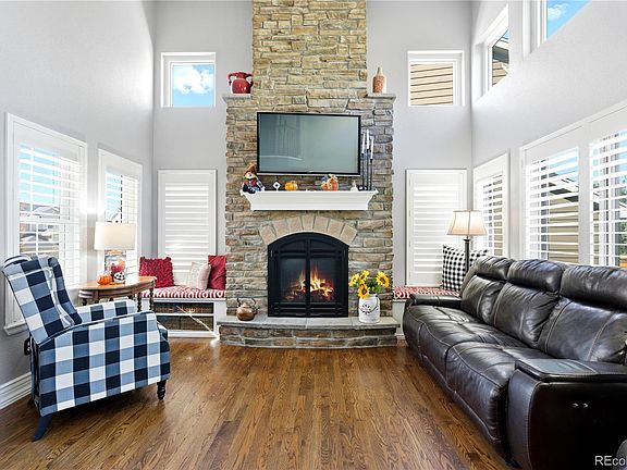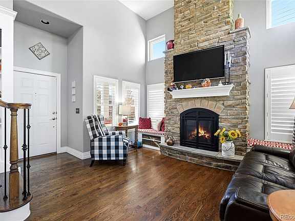 Discover this stunning two-story home in the heart of Highlands Ranch, perfectly blending modern updates with timeless elegance. Welcome guests on the inviting covered front porch and step inside to an open main level with soaring two-story ceilings in the family and dining rooms. The striking stone gas fireplace serves as a warm focal point, complemented by expansive hardwood floors, 6-inch baseboards, plantation shutters, and a built-in staircase bookshelf—showcasing the home's attention to detail. Enjoy energy efficiency and an abundance of natural light thanks to newer Anderson windows throughout. The updated kitchen boasts 42" upper cabinets, stainless steel appliances, a farmhouse sink, quartz countertops, and a stylish tile backsplash—perfect for everyday living and entertaining. Up the hardwood staircase with iron spindles, you'll find the spacious primary suite featuring a luxe ensuite bathroom. Enclosed by a custom barn door, the spa-like bathroom includes a walk-in shower, double sinks, and a private toilet area. Two additional bedrooms and a shared full bathroom provide plenty of space for family or guests. The finished basement offers a versatile open flex space with luxury vinyl flooring—ideal as a game room, office, additional bedroom, or home gym. It includes rough-in plumbing for a future bathroom and ample storage with a large crawl space. Step outside to the oversized stamped concrete patio with a built-in fire pit—perfect for outdoor entertaining. The backyard also features mature trees, a fenced area with a dog run, garden space, and front/backyard sprinkler systems. The 2-car attached garage is equipped with ample cabinets, storage racks, and a new garage door, while the southwest-facing driveway makes winter snow shoveling easier. Move right in to this exceptional Highlands Ranch home—ready to enjoy all its wonderful features!
