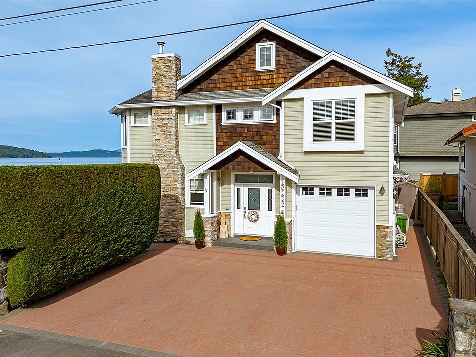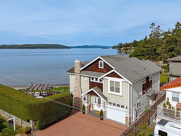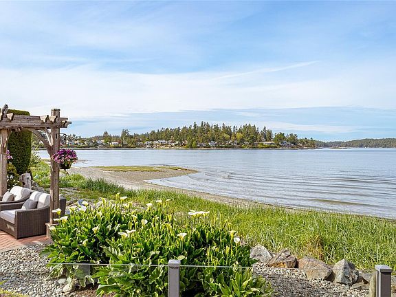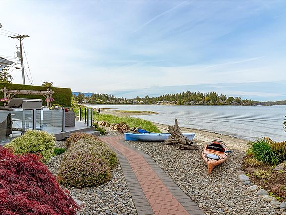 NEW PRICE! This exceptional waterfront home, custom-built, is nestled on a private lane with breathtaking views of Roberts Bay. The gently sloping waterfront offers easy access for kayaking and beach walks. The home boasts a gourmet kitchen with cherry wood cabinetry, granite countertops, crown moldings, central vac, and in-floor radiant heating throughout. Natural gas and an irrigation system for the a striking professionally designed seaside garden enhance comfort and convenience. With an easy walk to downtown Sidney, this unique property features water views from almost every room, four spacious bedrooms, three bathrooms (1 with a steam shower), and a low-maintenance yard with a brick-laid driveway and pathways. The beautiful patio extends the living space outdoors, and the attic offers a hobby room or ample storage. With flexibility for four to five bedrooms, this home is perfect for those seeking tranquility and coastal beauty.
