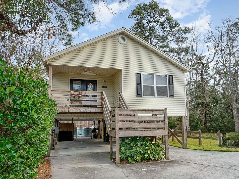 Welcome to Always 70 and Sunny! Walk or ride your golf cart to the ocean from this fantastic 3 bed 2 bath home with private outdoor pool! Beautifully furnished and tastefully decorated, this home has been freshly painted and updated with all new flooring, new light fixtures and new ceiling fans and features plenty of closet space, a washer and dryer and a storage closet under the home for all your beach toys and golf equipment. Wonderful open floor plan boasts vaulted ceilings in the living room and dining area with seating for six. Meal preparation is a pleasure in the fully equipped kitchen with abundant cabinet and counter space, stainless appliances and a double sink. The nice sized master suite includes bath with vanity and tub/shower and the additional two bedrooms share a Jack and Jill bathroom with vanity and tub/shower. Outside, your family and friends will love the private outdoor pool with plenty of room for everyone to gather and the covered front porch is the perfect spot to relax at the end of the day. Parking under the home provides room for your cars and golf cart and the extended driveway has plenty of space for your guests. Sparrow is a quiet, established community with no HOA located in the heart of Surfside Beach that allows short term rentals and just minutes from shopping, restaurants, fishing, golf , the Marshwalk, entertainment and attractions.Whether you are searching for a primary home , the perfect beach retreat or an investment property , this is a must see! Make an appointment to view this delightful home today!