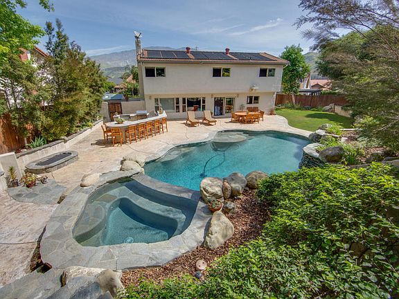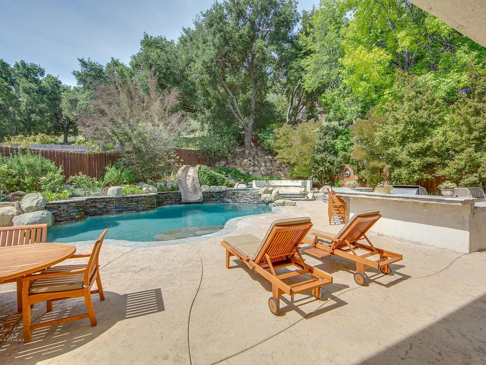 Resort Style living in a Great Neighborhood. Enjoy the good life in a backyard like no other in the area. Privately placed pool and hot tub include waterfalls, professional landscape, stamped concrete decking and even a slide. Outdoor kitchen features a charcoal and gas BBQ, power burner and sink. Indoors, the quality of materials is splendid. Polished slate floors and the gourmet kitchen are the focal points for entertaining in the open floor plan. For the discerning cook, there is a large Dacor dual fuel range/oven combo with 6 gas burners and 2 electric ovens. Built in appliances include a large GE Monogram series refrigerator, Speedcook oven, trash compactor and dishwasher. Beautiful and abundant cherry wood cabinetry is stained to a pecan finish to soften the tone. Granite slab counters adorn the counter tops and a sizable raised island bar seating 8. Backsplashes blend nicely with a mix of slate and insets of matching granite. The open floor plan includes the kitchen, living room and family room created during the remodel with a seismic retrofit. The upstairs master suite is spacious with a great walk in shower featuring 7 shower heads. This home is spectacular, yet comfortable. You will never want to leave, this is already paradise!