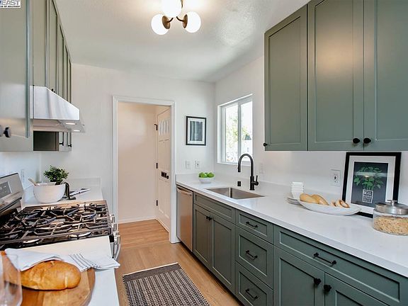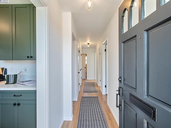 Located in a sweet Bay Farm Island neighborhood in a non-HOA community of ranch-style homes built in the 1950s, this completely remodeled single-level home offers a mid-century aesthetic combined with 21st century finishes and styling. Built in 1956 and remodeled in 2024, the home features 3 bedrooms, 2 bathrooms, an open living room/dining room, attractive kitchen, a den/home office and an attached garage. Details include a brick fireplace, dual-pane windows, fresh interior/exterior paint, refinished vintage oak floors, new light fixtures, and mature + refreshed landscaping. The sunny, private backyard has a patio, citrus tree, lawn, rose garden and much more. This highly desirable Bay Farm location is an easy stroll to Harbor Landing Safeway, Starbucks + shopping, and close to Leydecker Park's playground, green spaces and tennis and pickleball courts. Convenient access to Earhart Elementary/Lincoln Middle schools, South Shore Center amenities, and shoreline trails. There are only five non-thoroughfare streets in this charming neighborhood created when Bay Farm was largely undeveloped farmland. This is a great opportunity for those looking to downsize, or for first-time buyers looking for a move-in-ready home in a desirable location near schools, parks and convenient shopping.