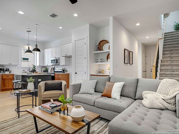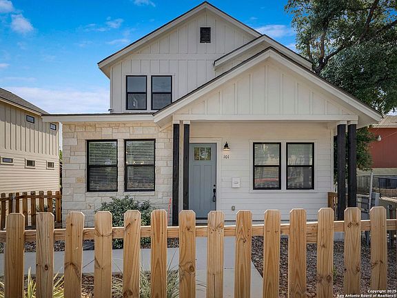 Perched atop a hill in the heart of vibrant Beacon Hill, this stunning new construction offers the perfect blend of modern farmhouse style and urban convenience. From the moment you step inside, you're greeted with an open-concept layout, soaring 10-foot ceilings, and rich wood flooring that creates a bright, airy ambiance throughout the main level. The gourmet kitchen is a chef's dream, featuring sleek quartz countertops, an island with a breakfast bar, stainless steel appliances, recessed lighting, and an adjacent dry bar perfect for entertaining. The spacious downstairs master suite is a true retreat, complete with a spa-inspired bath featuring double sinks, modern lighting, quartz counters, marble floor tile, a walk-in closet, and a tiled shower with seamless glass doors. Thoughtfully designed, the main level also includes a stylish powder bath, a functional mudroom caddy, and easy access to the private, fenced backyard with an oak tree. Upstairs, you'll find two generous bedrooms, a loft-style gathering room, a contemporary double-vanity bath, and a well-equipped laundry room with built-in cabinetry and countertop space. Enjoy the best of city living with walkable access to trendy restaurants, charming antique shops, local boutiques, and cozy wine bars. Just minutes from downtown, the San Antonio Zoo, and the Pearl, this is urban living at its finest, with all the comforts of home.