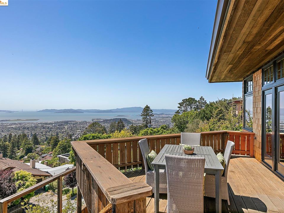 Located in the Berkeley hills, directly opposite the Golden Gate, this custom-built view home was designed by noted architect Jerry Langkammerer and enjoyed by the original owners since 1977! Perfectly oriented to showcase the mesmerizing 3-bridge view, the public spaces are great for entertaining, with a split-level great room, dining room, and kitchen all facing the Bay. In the evening after spectacular sunsets, the San Francisco city skyline sparkles in the distance. Light pours through the large windows, and French doors open to two levels of decks for seamless indoor-outdoor living. The house is level-in, with clean contemporary lines, high ceilings, wood floors, a fireplace, and artfully crafted custom kitchen cabinetry and built-ins by Berkeley Mills. On the main level, there is a den, an office and 2 bedrooms. The lower level features a primary bedroom with an expansive closet and full bath plus a second large bedroom with French doors to the lower deck. Revel every day in the beauty of the Bay!