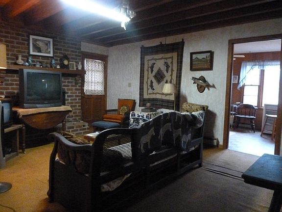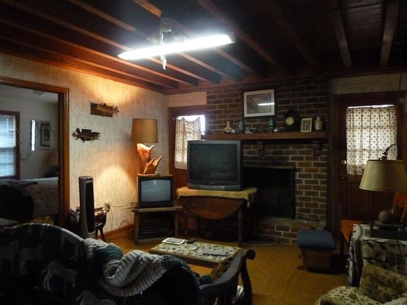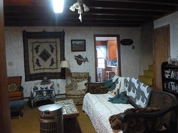 Cozy cottage nestled in woods on 13.55 acres. Views of pond. Great winter views of mountains. Great as permanent residence or weekend get-a-way. Entry level includes open kitchen/dining area with picturesque views of lake, family room with masonry fireplace, 2 family bedrooms & full bath. Upper level has 14x34 potential bedroom, hobby/game room. 8x14 covered front porch (needs work).
