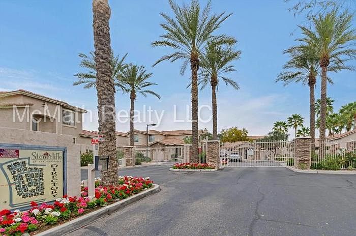 Beautiful town home in gated community. Nicely updated with wood floors and new carpet. Kitchen has breakfast bar, lots of cabinets and white appliances. The master suite has plush carpet, a ceiling fan and a picture window. The master bath has an extended sink vanity and a spacious walk in closet.The backyard is private with a covered patio and desert landscaping. The community amenities include a pool, playground and greenbelt. Water, sewer & trash are included with the rent.$200 admin fee is due at lease signing. Phoenix charges a monthly tax of 2.3%.Pets with owner approval. This property allows self guided viewing without an appointment. Contact for details.