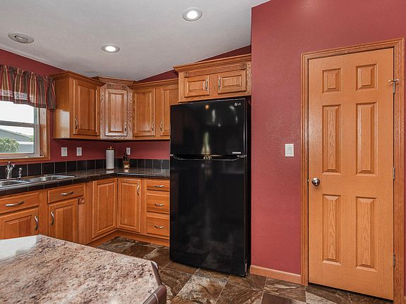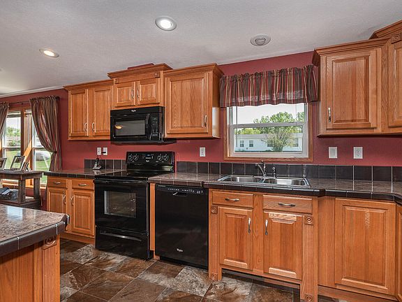 Welcome to this beautifully maintained, 2013 Schult home, situated on owned land—no lot rent required & no special assessments! This spacious, one-level home features 3 oversized bedrooms, each with its own walk-in closet, and 2 full bathrooms. The kitchen is a key feature, offering upgraded cabinetry, a center island, ample counter space, and a side pantry. It opens to a large dining area with room for a full-sized table, perfect for hosting large gatherings. The adjoining living room is warm and inviting, featuring generous space and large windows that fills the room with natural light. The primary bedroom offers both comfort and privacy with its large walk-in closet and full en-suite to includes a dual vanity and a one-of-a kind custom shutter. Two additional oversized bedrooms and a full bathroom plus a conveniently located mudroom/laundry complete the interior living space. Outside you will enjoy nearly a 1/2 acre lot with room to grow. The true highlight of the exterior is the oversized 40'x28' three-stall garage with 8x10 doors, a built-in workbench, and abundant room for vehicles, tools, and hobbies. This home is in excellent condition, featuring clean finishes and upgraded insulated skirting for improved energy efficiency. Eligible for VA, FHA & First-Time Buyer Programs!