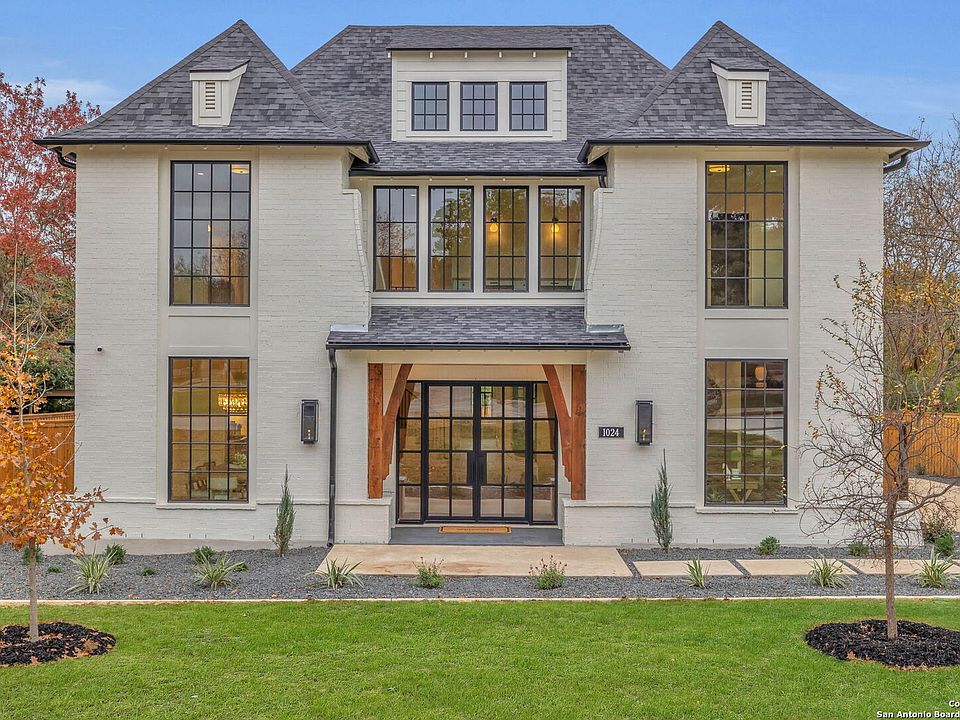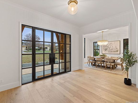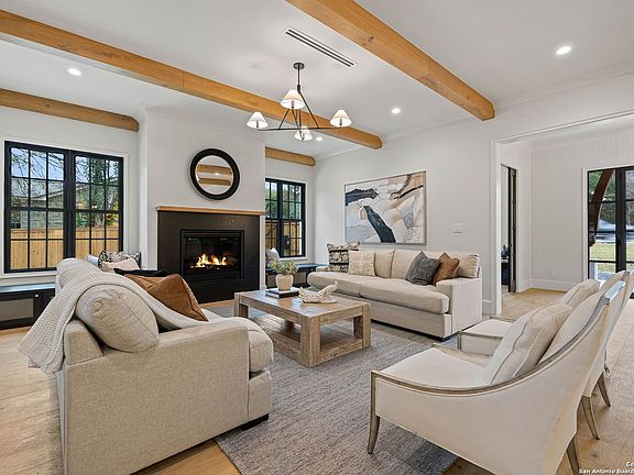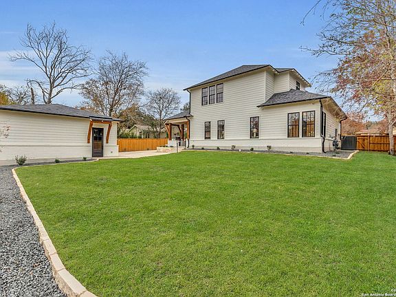 Nestled in Terrell Hills, this newly constructed residence by Kana Homes showcases meticulous craftsmanship and thoughtful design with a pristine finish that exceeds convention. Luxury light fixtures and oversized windows with sleek black trim punctuate 4,701 sq.ft. of living spaces, illuminating beautiful white oak floors and a perfect blend of coffered and exposed beam ceilings. The foyer leads to a private study and formal dining room, thoughtfully positioned opposite each other in elegant symmetry, the study hosting a gas fireplace, built-in shelving and elegant pocket doors for privacy, while the formal dining room features a resplendent chandelier. The great room centers around a large gas fireplace, flanked by oversized windows with inviting window seats and outdoor access. The chef's kitchen impresses with a large walnut island featuring gleaming Calacatta quartz countertops and a breakfast bar, white tile backsplash, a JennAir 48" gas range, pristine cabinetry with integrated Liebherr refrigerator and freezer and a luxurious butler's pantry offering a JennAir coffee station and microwave drawer, Miele dishwasher and a dual-zone wine fridge, all seamlessly incorporated amidst the walnut cabinetry and marble backsplash. The downstairs primary suite features tasteful wall paneling and an opulent en suite bath adorned with black and brass accents including an oversized walk-in shower with honed marble tile floor and ceramic Zellige tile backsplash, a sumptuous soaking tub, a Carrera quartz dual vanity, and access to dual closets equipped with laundry connections. Ascending the staircase reveals a capacious bonus room with a Carrera quartz wet bar and half bath, a stylish laundry room offering a Calacatta quartz island and abundant storage, a cozy reading nook/study with two desks providing a tranquil retreat and all secondary bedrooms. Outdoors, your 538-square-foot covered living space awaits with gorgeous slate tile, a grand fireplace and built-in Coyote BBQ, all overlooking landscaped grounds, ensconced within a veil of privacy. *Please note the glass to the master shower is on order and will be put in as soon as it comes in.