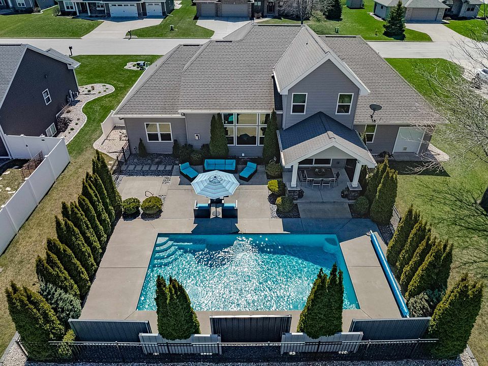 Modern luxury living! Stunning kitchen boasts sleek & stylish cabinets, stainless appliances, pantry, glass backsplash & exquisite quartz countertops. Open-concept design. Spacious living rm boasts a fireplace & soaring, trey ceiling. Primary bdrm has a W/D in the W-I closet w/ center island & private bathrm featuring the tiled W-I shower & double vanities. Office on the main level could be a bdrm. 2 large bdrms & a full bathrm are located upstairs w/ a 2nd laundry area. Sprawling 3.5+ car heated/finished garage w/ extra workshop area & garage door out the back & more. Experience relaxation & rejuvenation in your private oasis with an inground salt-water heated pool, fire pit & covered porch. This home is one of a kind! Don't miss out!