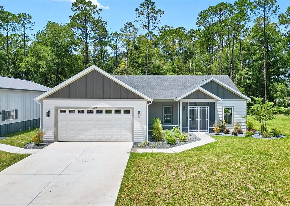 Welcome to your own private Oasis! Nestled in the country settling of Lady Lake, this 3BR/2.5BA NEW CUSTOM home with a NEW 1,440 SQFT Morton detached garage with NO HOA nor Deed Restrictions is calling your name! Featuring an OVERSIZED .55 ACRE lot this home is located within minutes of The Villages, Lady Lake, shopping, dining, and so much more right at your fingertips. Recently built, this home features 4 zoned foam insulation, a 26 KW Generac Generator, a paver patio, an Irrigation system, a water treatment system, and much more. Upon arriving at the home you are welcomed with timeless charm, featuring rock landscaping, hardy board siding, and a charming screened-in porch. Stepping inside you will be just as impressed with an open layout, vaulted ceilings, luxury vinyl plank flooring, 5-inch baseboards, recessed lighting, and an inside laundry room with LG washer/dryer. The kitchen is stunning with two-tone cabinets, quartz countertops and backsplashes, stainless steel appliances, a walk-in pantry, dining area, and a massive kitchen island overlooking the living room. The master suite is spacious with a tray ceiling, a walk-in closet, and an impressive ensuite featuring HIS/HER sinks, a private lavatory, a soaking tub, and a walk-in tiled shower. The guest bedrooms are also spacious, with closets and a shared hall/guest bathroom. As if that wasn't enough, the lanai is enclosed with custom glass doors (creating a Florida sunroom), increasing space for family fun and entertaining which leads out to a gorgeous paver patio with a fire pit. The garage is expanded with a MINI SPLIT perfect for converting it into a gym, mancave, ETC., has an insulated garage door with windows, and with FOAM insulation you can expect lower utility bills and a cooler house. The impressive 30x48 feet Morton Building features an 18x10 feet automatic door, LED lighting, 15-foot eaves, and much more, making it your dream garage for all your toys or for more storage. With too many upgrades and things to list, this home is a must-see… Call today and schedule your private tour!