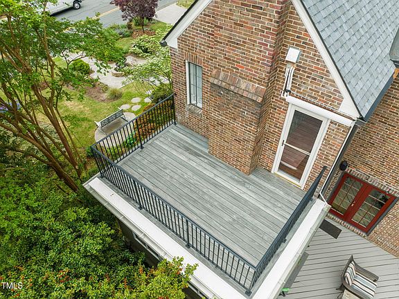This impeccably maintained all-brick 1930s home—with a stunning contemporary addition—stands out even among the many beautiful houses in Trinity Park. The list of updates and improvements made by the current owners is impressive in its own right, but this home also features rare and highly desirable elements, including primary bedroom suites on the first and second floors. Few homes offer a first-floor primary suite, and none can match the soaring ceilings and clerestory windows here, which allow you to wake up to views of sky and treetops. It's equally rare to find a functional second-story porch—especially one crafted with Acoya decking and custom ironwork railings—accessed from a large upstairs ensuite where you can enjoy your morning coffee among the birdsong and tree canopy. A walk-out basement is another uncommon feature in Durham's historic homes, particularly one with a kitchenette and ample daylight from multiple windows. An attached garage is also rare—especially one with this much storage space. Beyond these standout features, the home's curb appeal is undeniable. As you approach, note the flat, well-pointed bluestone path winding through mature landscaping. Ascend the brick steps to the classically proportioned front door, accented by a subtly modern paint palette. Inside, the solid wood door opens to a welcoming foyer. The living room features gleaming hardwood floors, a cozy fireplace, and generous windows that invite light and conversation. Beyond the living room lies a bright, airy office/library. One graceful step up leads to a spacious dining room with expansive views of the front yard. To the rear is a well-designed kitchen featuring an AGA range and color-matched SMEG refrigerator and dishwasher. Ample pantry storage lines the walls near the convenient side entry. At the back of the main floor—nicely separated from the communal spaces—is a luxurious, oversized primary suite. Upstairs, you'll find three additional bedrooms and two more full bathrooms. On your way up, pause to admire the elegant curve of the staircase, as well as the eye-catching brass light fixture with its floral design and delicately cut green glass diffuser. The upstairs suite boasts a newly renovated bathroom that blends period-style floor tile with a chic retro-modern vanity and wall tile. A large walk-in closet and the bespoke treetop balcony complete this private retreat. The two other upstairs bedrooms are spacious and share a well-preserved Jack-and-Jill bathroom with original tile and fixtures in excellent condition. The basement is perfect for movie nights or game time. The kitchenette is ideal for quick snacks, and with the addition of a bathroom—as envisioned by the architect—this level could serve as a wonderful guest or caretaker suite, complete with its own entrance. There's also extensive dry storage in the unfinished portion of the basement. Step out the back door and you'll find a multi-level deck that's perfect for dining and entertaining, with serene views of the flat, grassy, tree-lined backyard—just off the living room. There's also ample parking in front of the garage. The newly poured concrete pad is sloped to direct water to drainage pumps, which move it safely away from the home, preserving the very sound foundation and structure for the long term. Be sure to review the full list of improvements, including a whole-house generator, all-new roofing, repointed brickwork, and more—all ensuring this home is well-positioned for future generations to enjoy well into its second century. All this, in one of Durham's most walkable and desirable neighborhoods. Duke's East Campus is a block away. The shops and restaurants of Brightleaf Square are within an easy walk, as is Whole Foods and 9th Street. All that downtown Durham has to offer is just moments away from this gorgeous home.